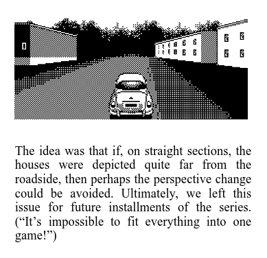 While quite technical and mostly aimed to people with some experience in programming and 2D graphics, the book does not require deep knowledge of assembly and low-level architecture of 8-bit computers. For a layman like me it was very interesting to find out how much of the engine design consists of “smoke and mirror” effects to make the player perceive things that, due to the hardware limitations, cannot be really represented properly. And where pixels truly must be drawn, a lot of skill is needed to do so efficiently. To make just one example, the engine applies different treatments to entities that conceptually should be similar (e.g. the player’s car uses different rendering algorithms and storage formats than the opponents’).