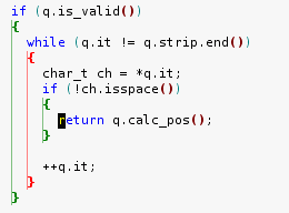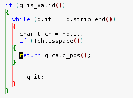 How often do you encounter such a case? Yes, you can paste with auto-reindent (just  ' ]p '  in vim), but often you forget to, or you reach this case not because of pasting the block, but because you added or removed stuff above. You just have to indent it a bit, and you’ll be done. In other editors, you move around, you select, you type TAB or the shortcut to auto-indent. Not so with vim, just three keystrokes:  ' >aB '  ("indent a Block") and you get this: