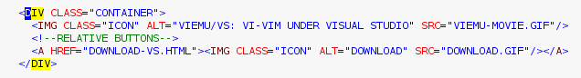 And as a final example, even if it seems vi is just about cryptic and unreadable commands, we are going to see some of the more visual aspects (actually, they are vim features, rather than vi original ones). One of them: with  ' hlsearch '  enabled (off by default in vim, but easily enabled with ":set hlsearch"), when you search for a string, all its matches are highlighted on the screen. Say you have the following html code: