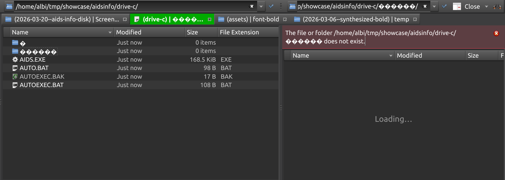 Incredibly, DOSBox managed to withstand the abuse by the malware and replicate the structure, full of special characters, on my ext4 partition. Typing the names of the directories was hard, but by judicious use of the Tab key I could navigate the drive, both in DOSBox and in native Linux: