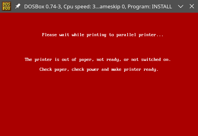 I launched the installation program. On DOSBox-X, it failed. Vanilla DOSBox had better luck and successfully completed the install but, after that, the experiment went awry. For unknown reasons – maybe I should have populated the hard disk with fake system files? – the malware triggered immediately. After a brief “Installing…” screen, I got this message: