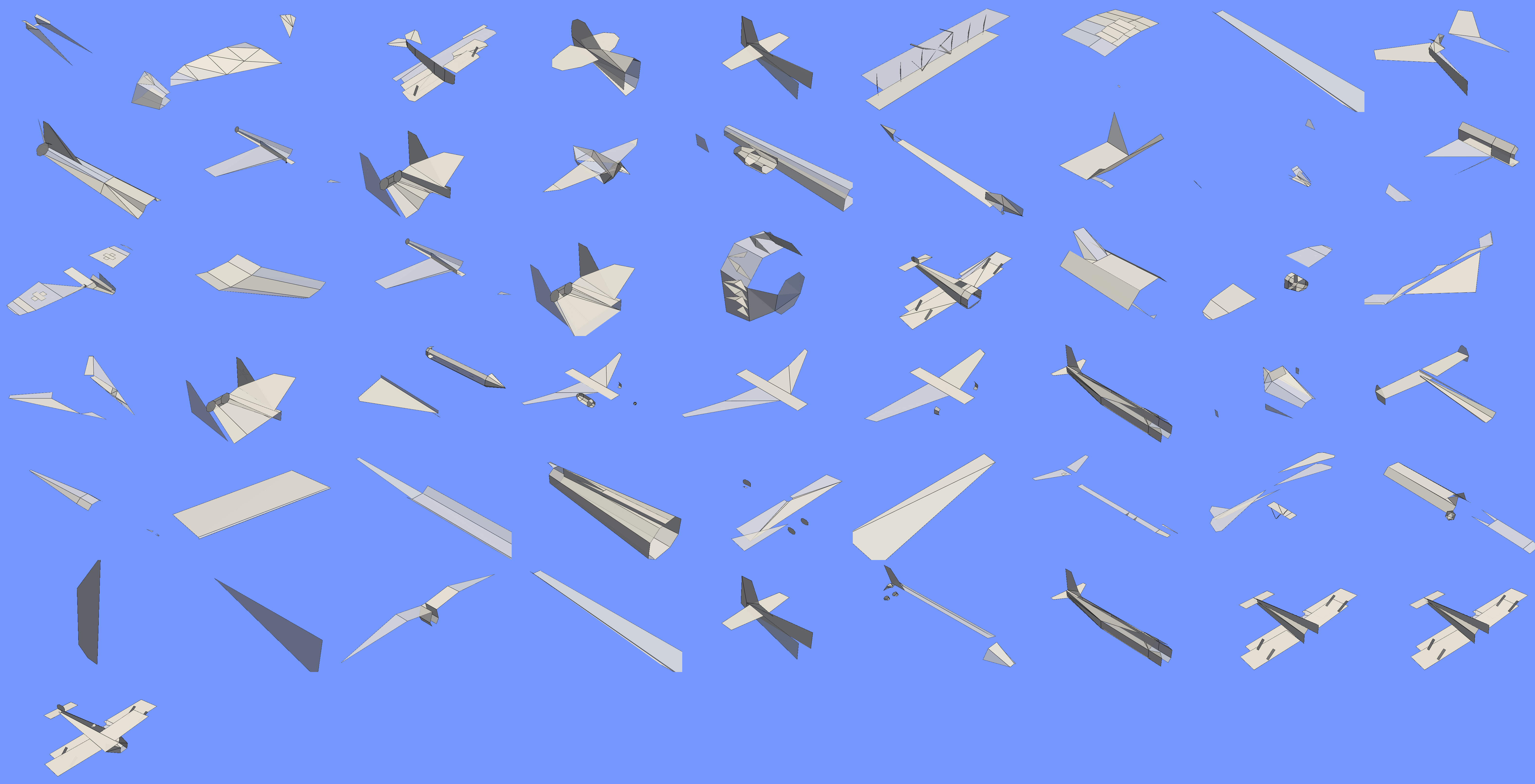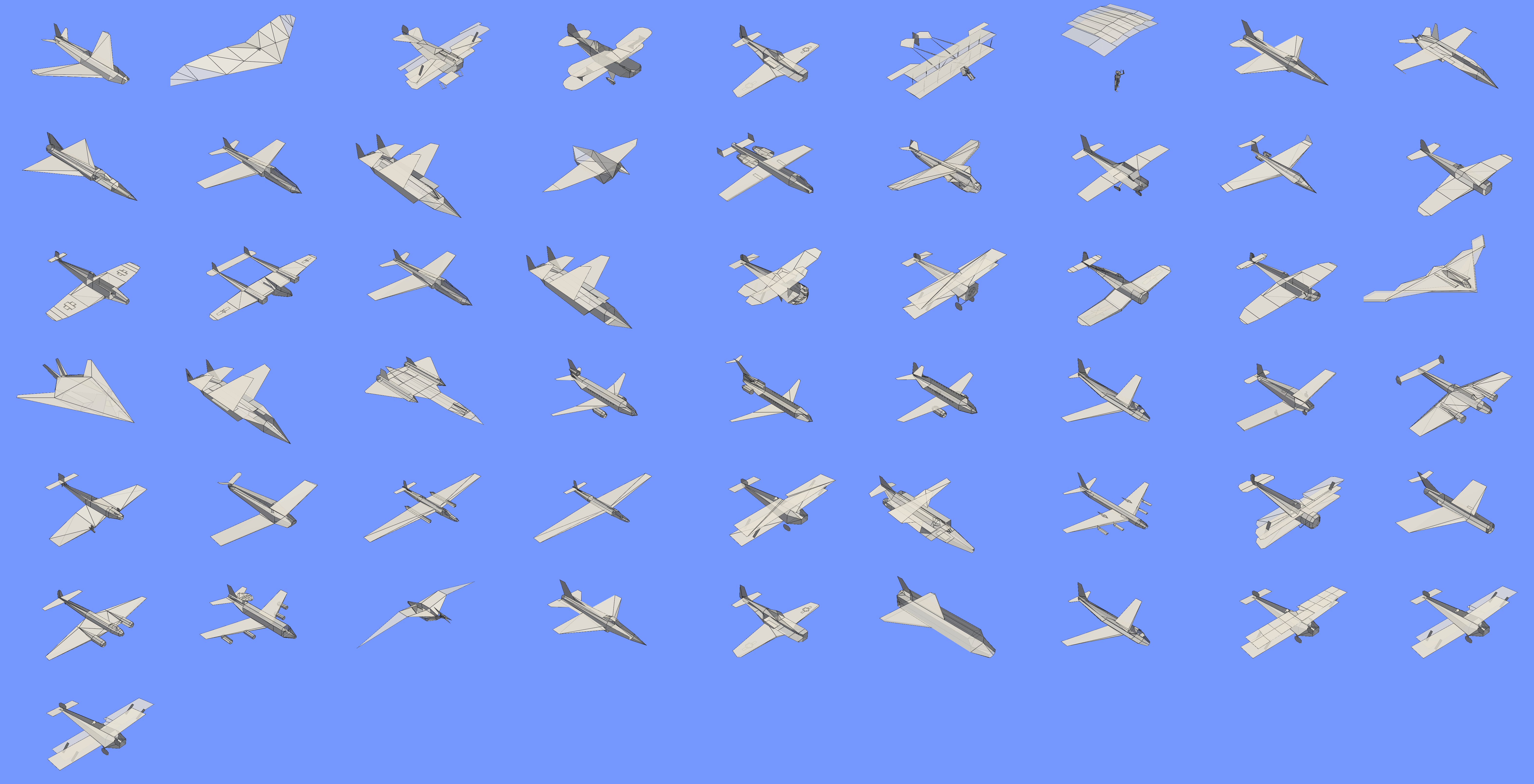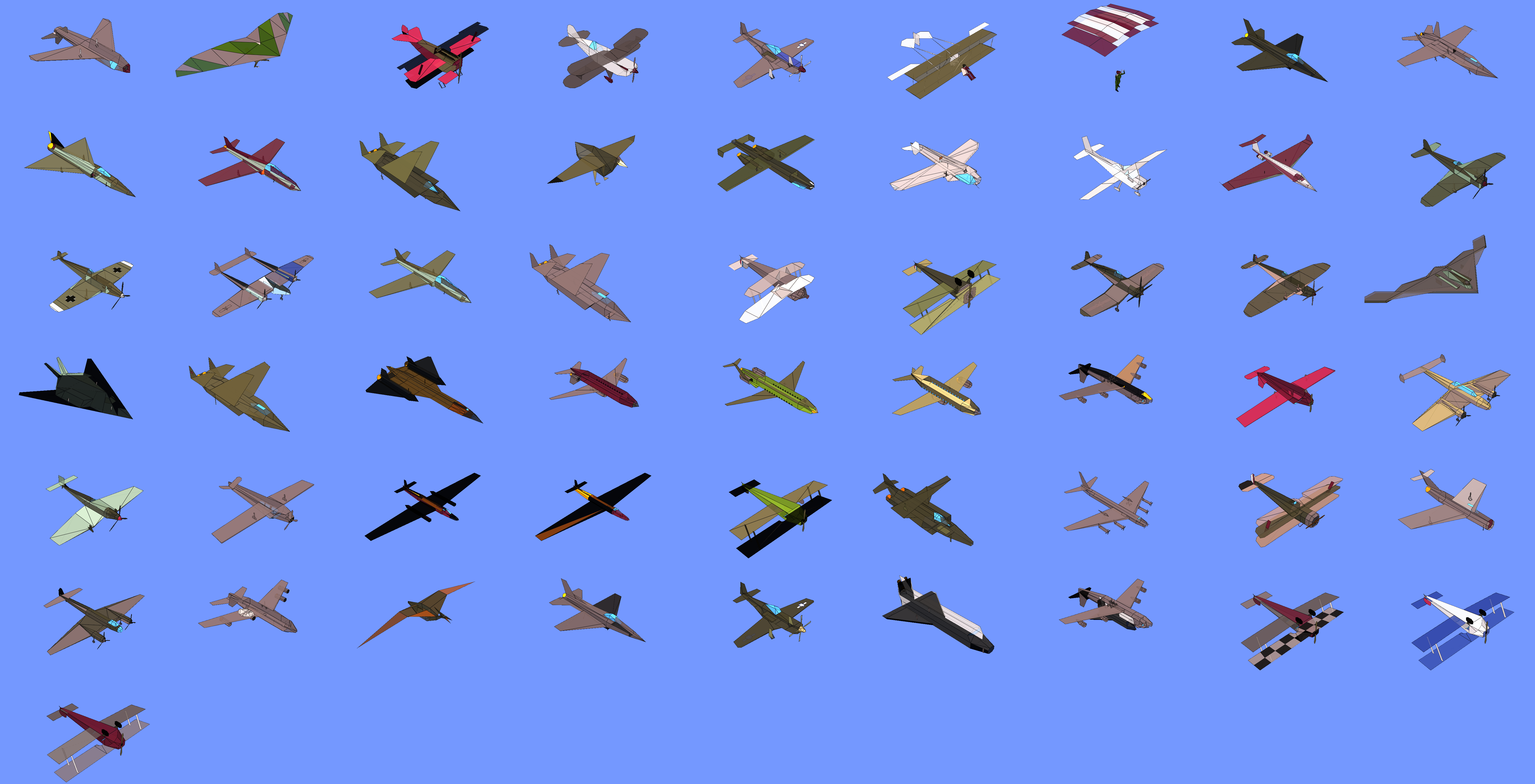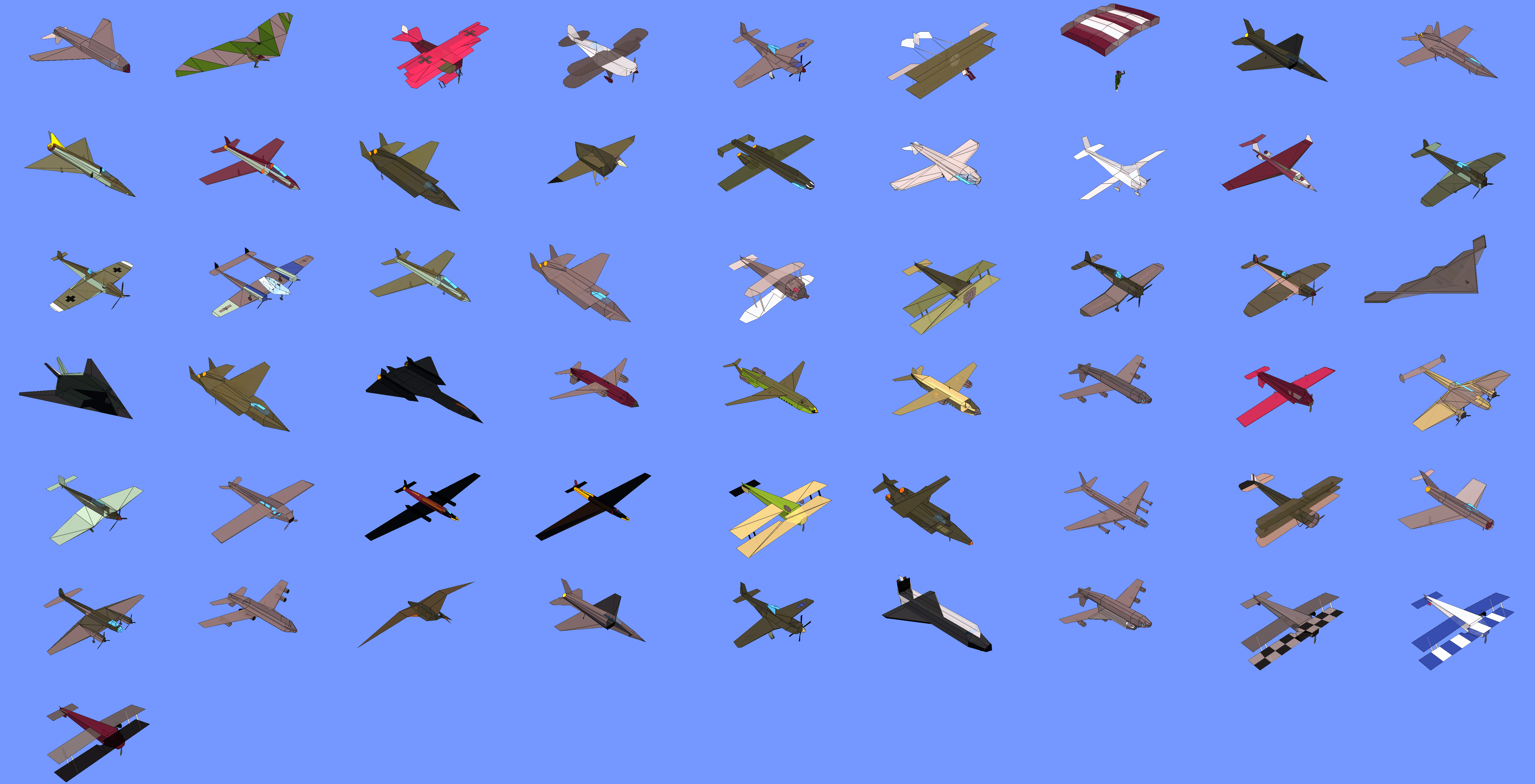 I was quite happy to see the LLM make progress by just saying “this does not look right, please retry”, but I would have also liked to add my own brain into the effort. Unfortunately, this was not to be. The documentation about the SOD language is too fragmentary, and parsing the datafiles by hand and seeing what the decoder was doing wrong would have taken a lot of time. One thing I would have liked to figure out is the exact semantic of the IFVIS keyword: I have the feeling that it really behaves like an if-branch, rendering certain directives if the model part is in full sight and others, more simplified, if it is occluded or far. I tried to make the decoder skip one or the other branch of this directive, but both choices led to the planes losing parts. On the other hand, rendering both branches results in polygons overlapping, with Z-fighting and parts in wrong color.