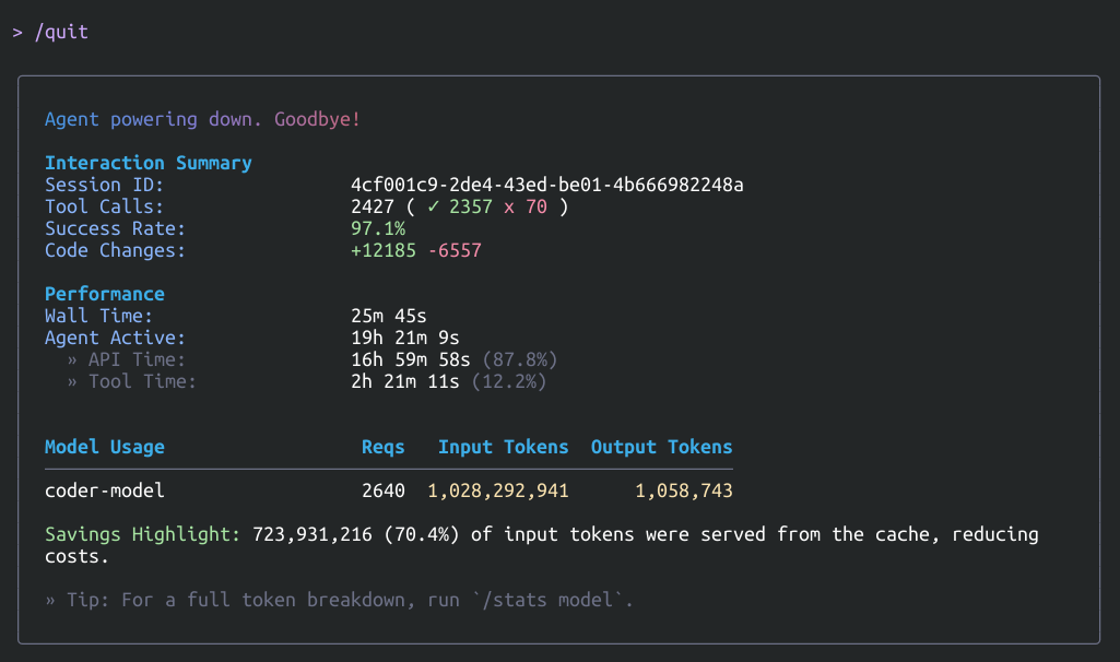 I was about to give up and open the wallet, but one of my last attempts struck gold. Alibaba’s Qwen CLI offered an absurdly good deal with 1000 requests per day and no token limit. Given the generosity of the offer I was skeptical about the effectiveness of the model, but I had to change my mind. It took a while to find the right incantation to start the CLI without it exhausting the memory,