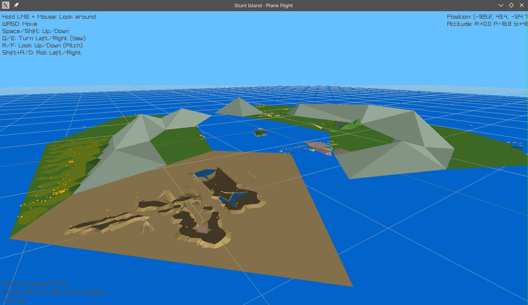 Now I had a wealth of assets floating around and still some desire to try out vide-coding. I went for the most immediate choice, making a program to navigate Stunt Island’s environment in 3D. A similar software, called SI Free Flight, had already been made by an anonymous programmer in year 2000 and I was not planning to add fancy features, so I went on to just building a remake, whose added value was the usage of modern technology (e.g. unlimited window size) and open source license allowing anyone to make improvements. I thought of choosing a new title, but I could not find one I liked, so I went with SI Free Flight – Take 21.