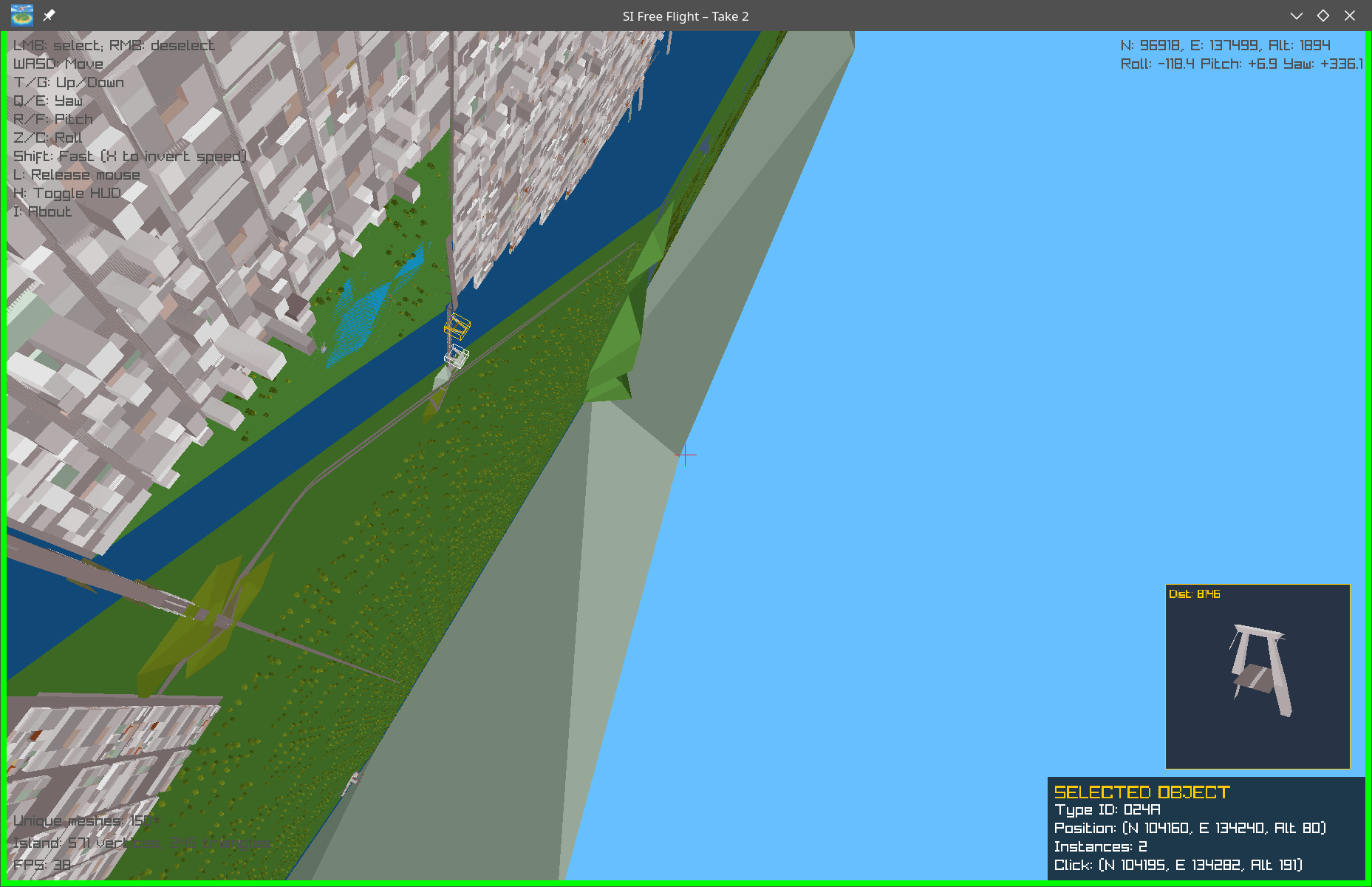 The rest of the project was fairly easy sailing: I tweaked the controls and, to make something fancy, added a TIE Fighter-style targeting computer. I tried to fix as many rendering glitches I could, but some issues remained that could not be easily solved. The base altitude of the objects, for example, is not in the scenegraph and I was unable to reverse-engineer how the game computes it. Since most of the objects have it at the sea level this is not a fatal flaw, but has unpleasant consequences such as the bridge roads collapsed into the water and the castle on the central islet buried under earth.